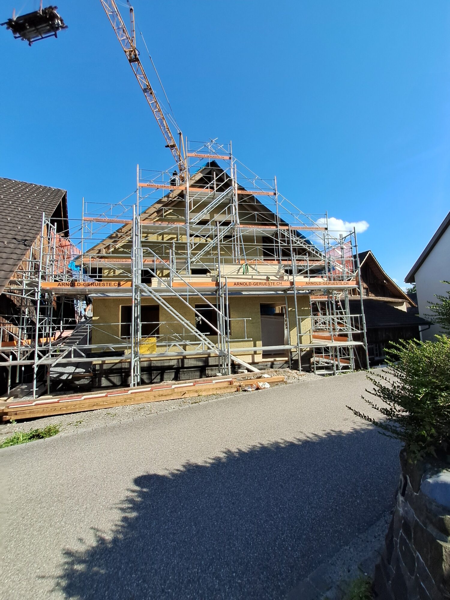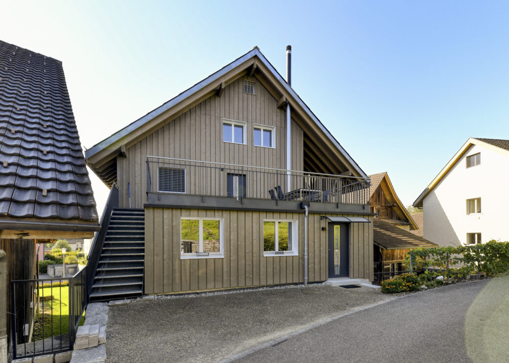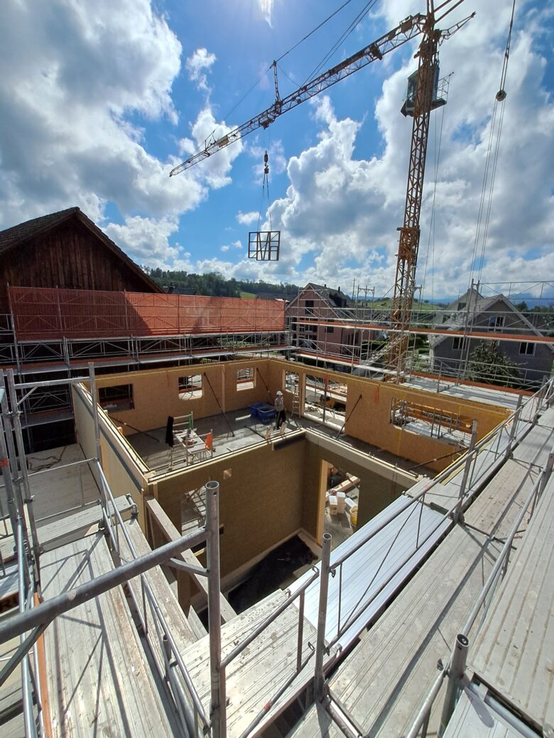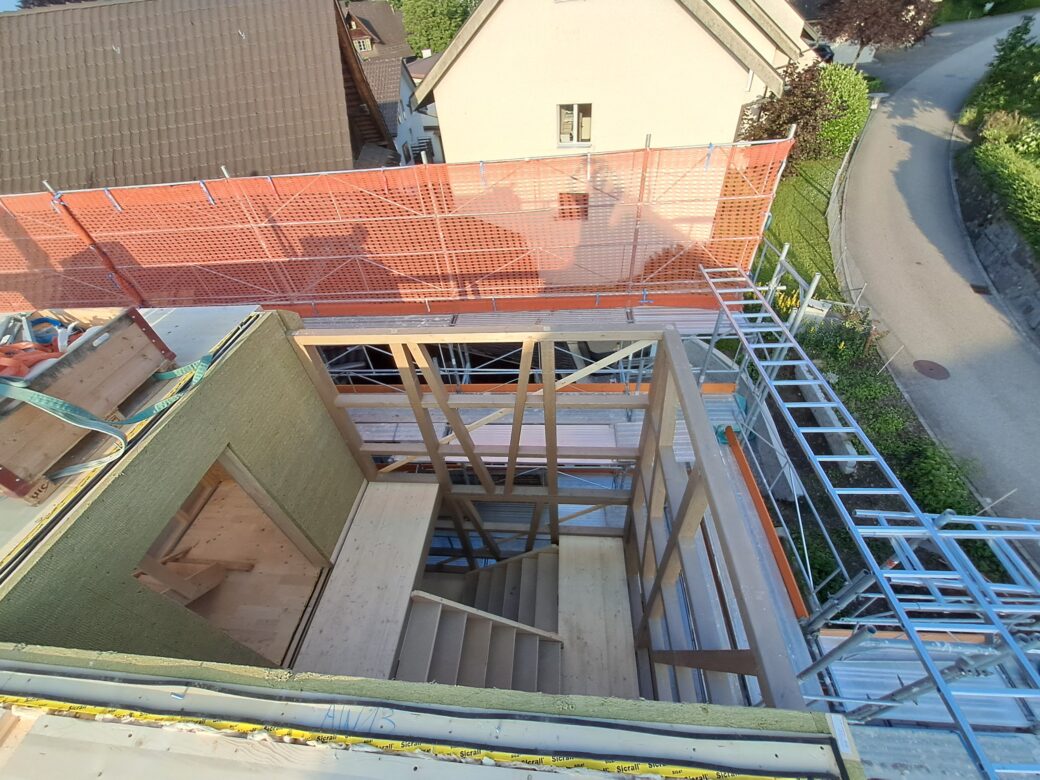 Aufstockung Oberdorfstrasse, Knonau Leistungen Baueingabe Detail- & Ausführungsplanung Elementbau Alu-Fensterzargen Balkon- Terrassengeländer Projektdaten Neubau Aussentreppen Baujahr 2023-2024 Architekt / Bauleiter Ernst Schindler
