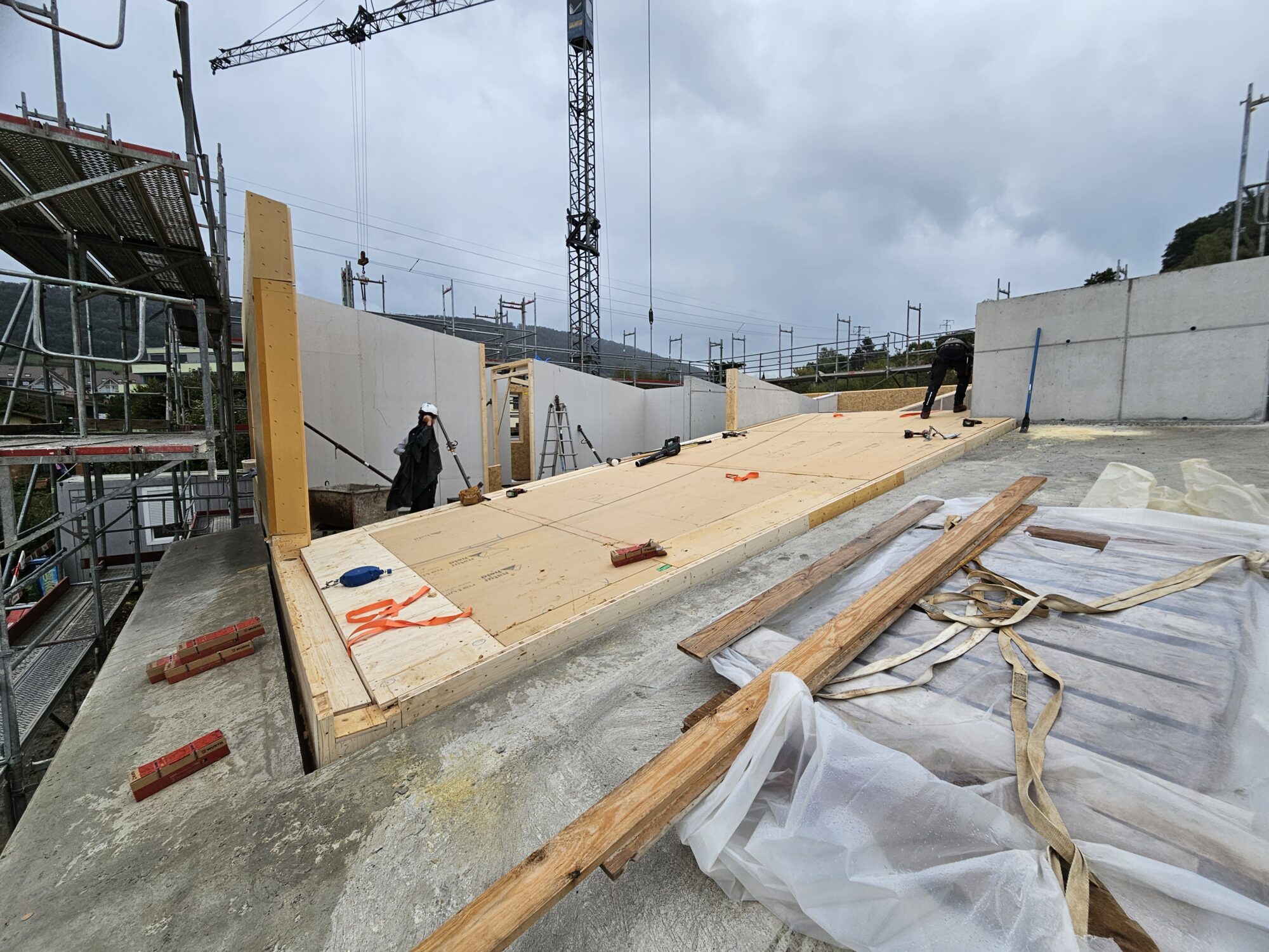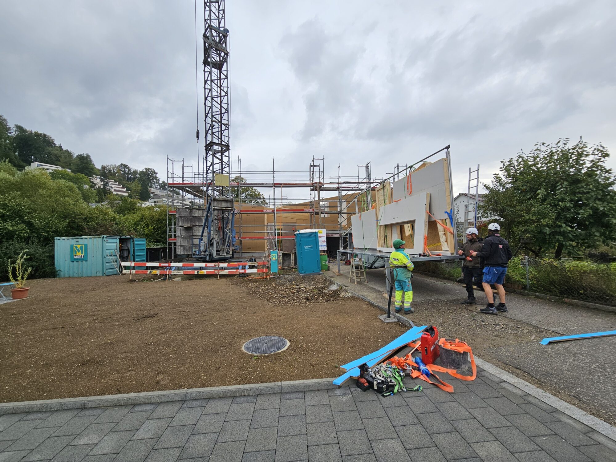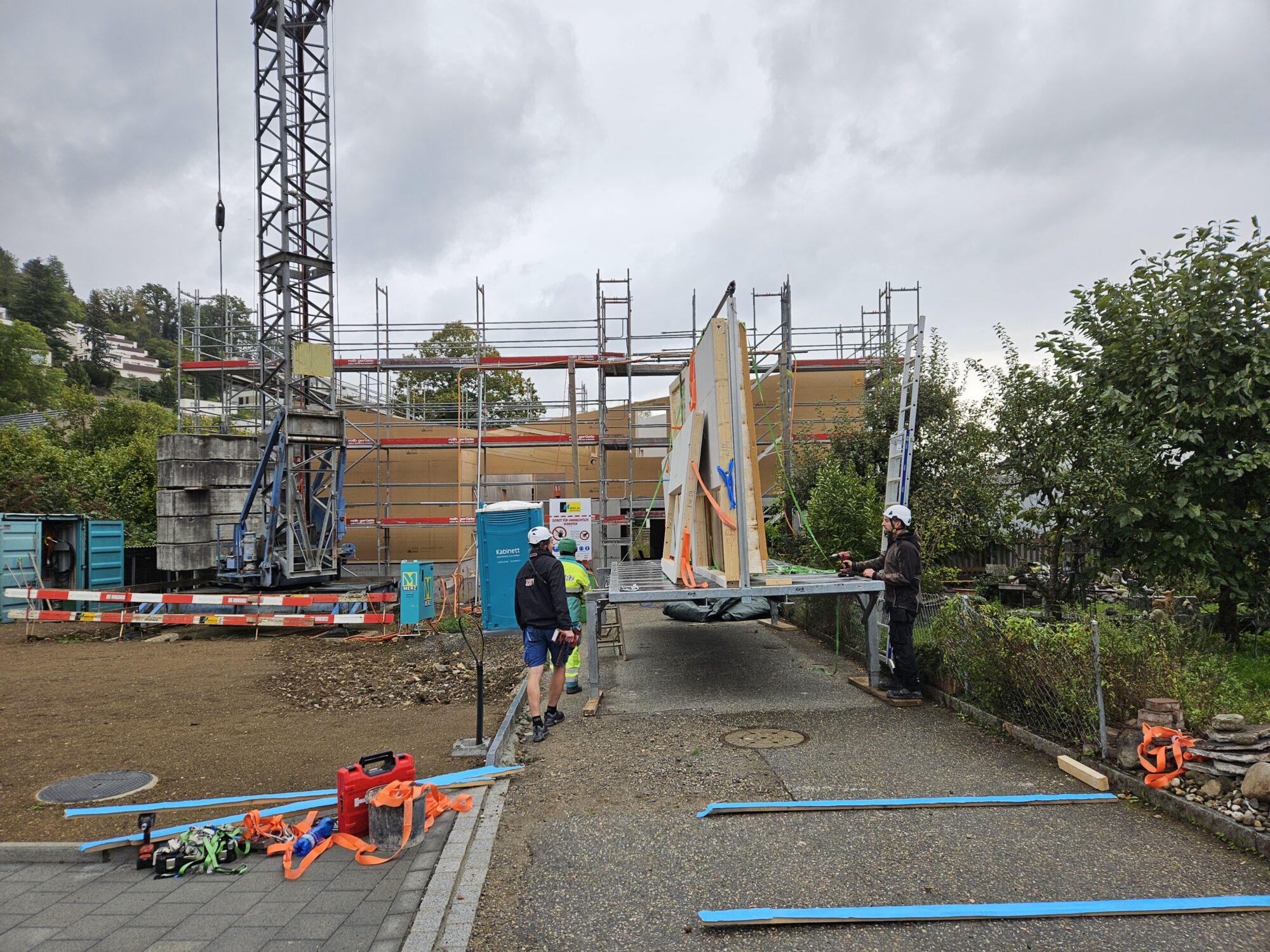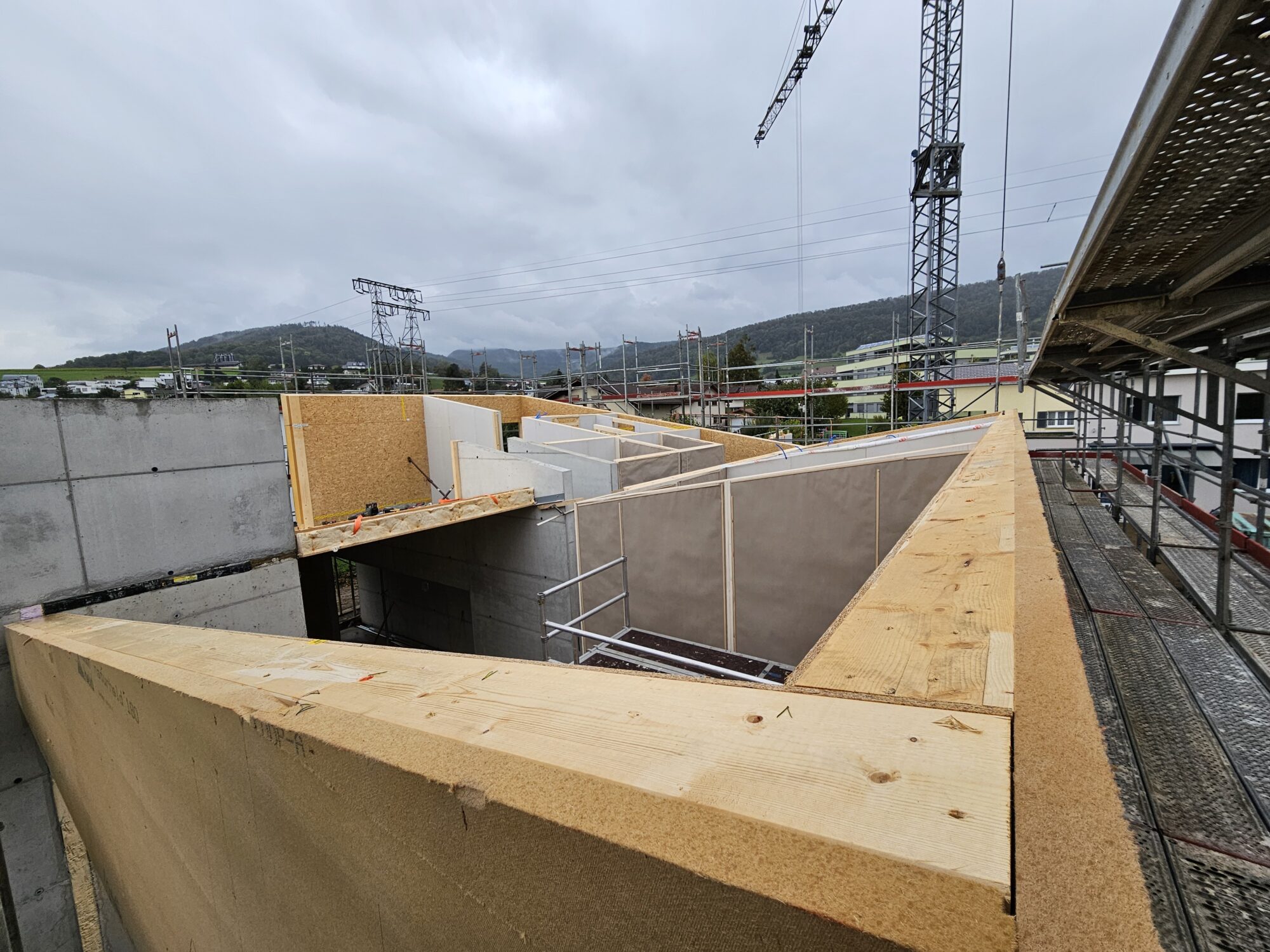 Neubau EFH, Kilbigstrasse, Erlinsbach Leistungen Planung & Ausführung Holzelementbau Massaufnahme mit Tachymeter Projektdaten 2-geschossiger Holzelementbau Sichtbare Wandelemente Deckenpaneelen Baujahr 2024-2025 Architekt / Bauleiter Studiotho GmbH