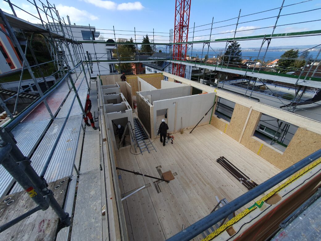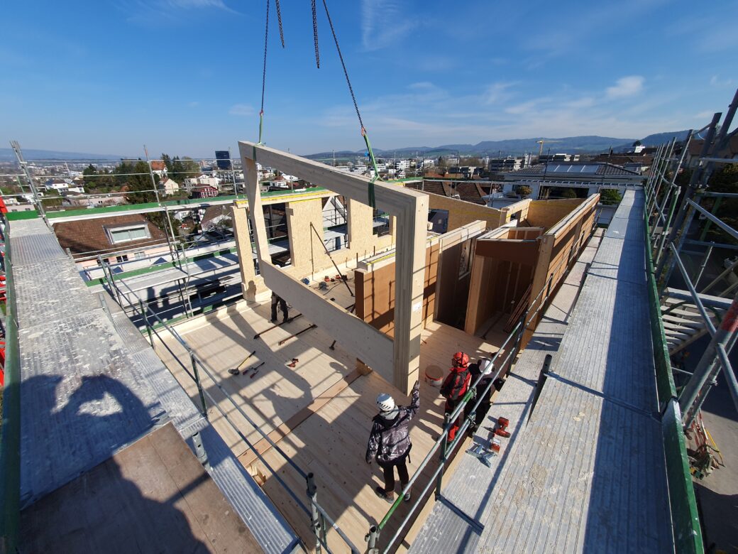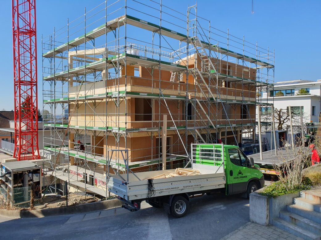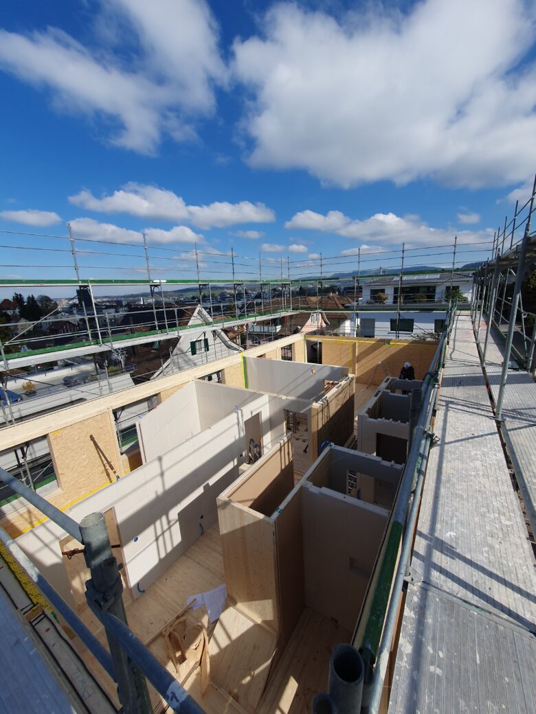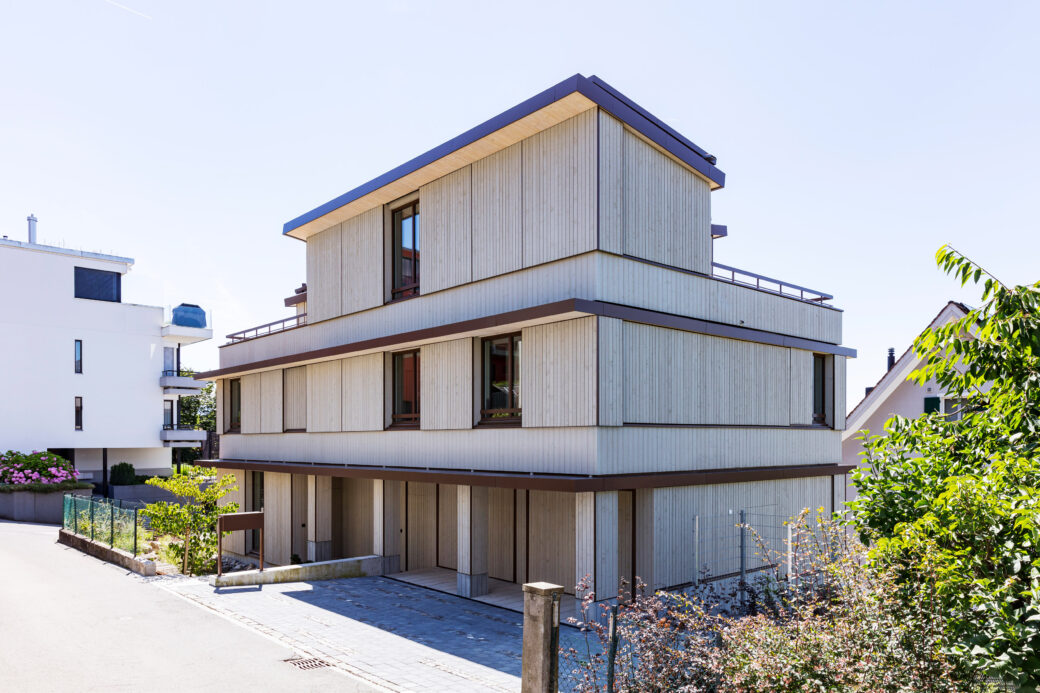 Neubau MFH Ringstrasse Zug Leistungen Planung & Ausführung Holzelementbau Bekleidung aus vertikalen Holzlamellen Innenausbau Projektdaten 3-geschossiger Holzelementbau Sichtbare Boden- und Dachelemente Holzfassade Baujahr 2023