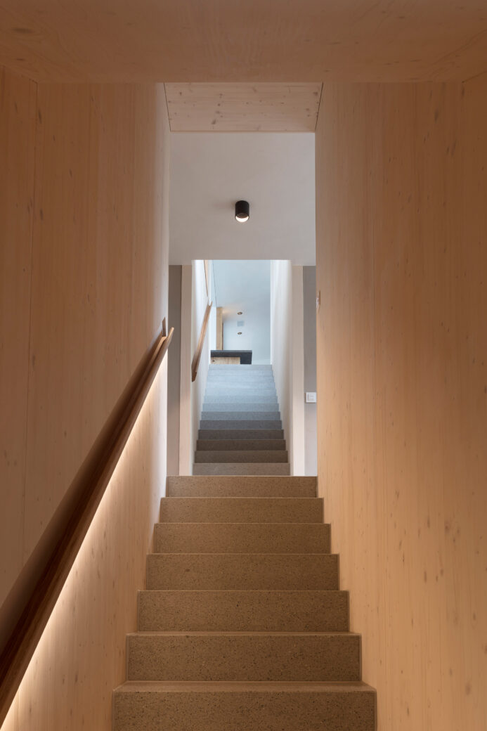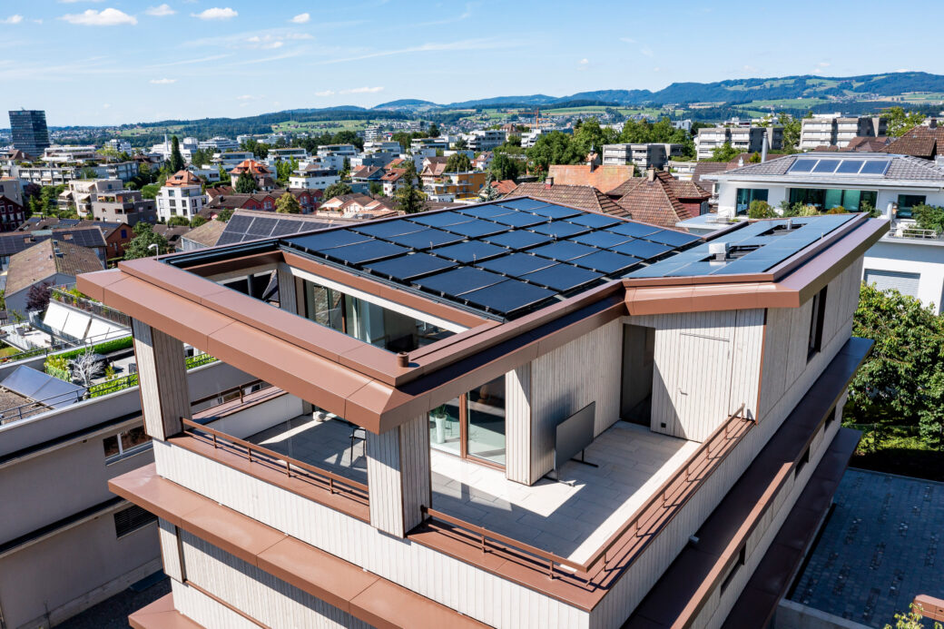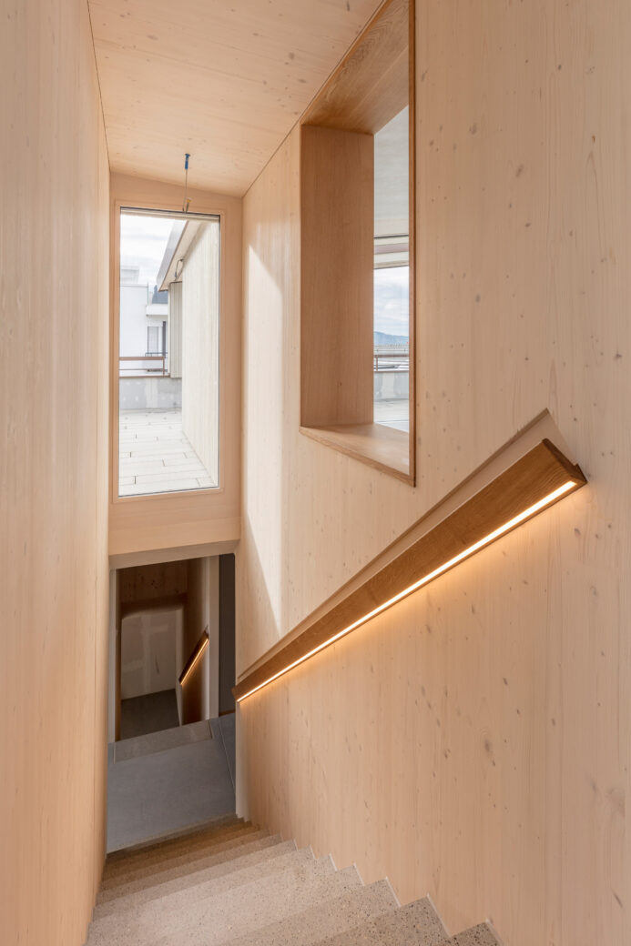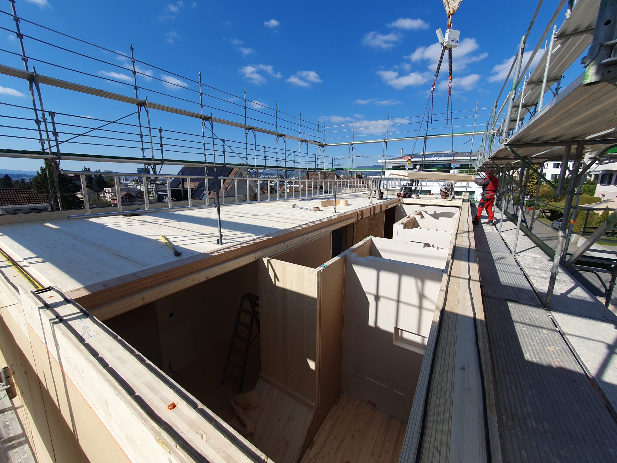 Neubau MFH Ringstrasse Zug Leistungen Planung & Ausführung Holzelementbau Bekleidung aus vertikalen Holzlamellen Innenausbau Projektdaten 3-geschossiger Holzelementbau Sichtbare Boden- und Dachelemente Holzfassade Baujahr 2023