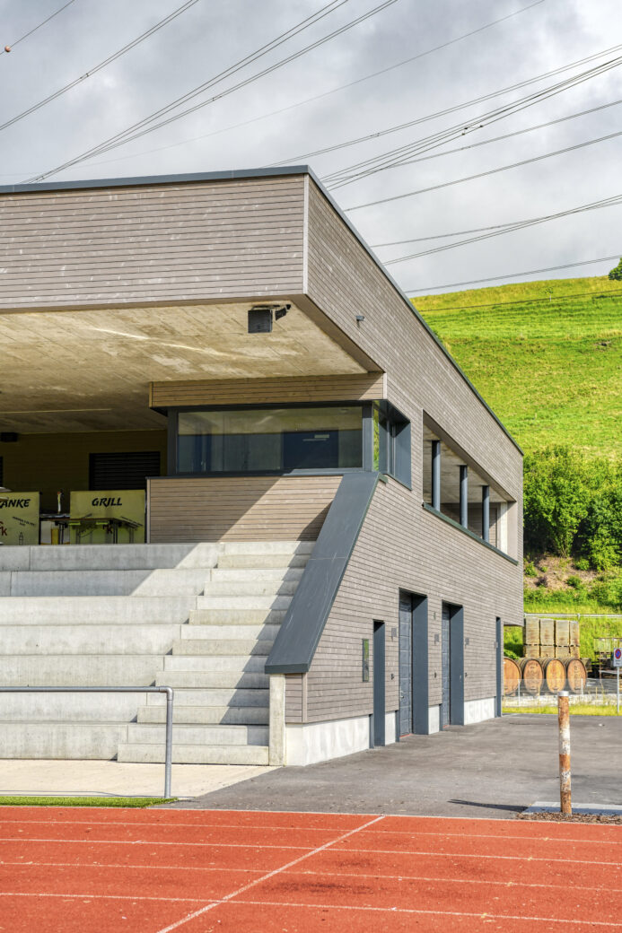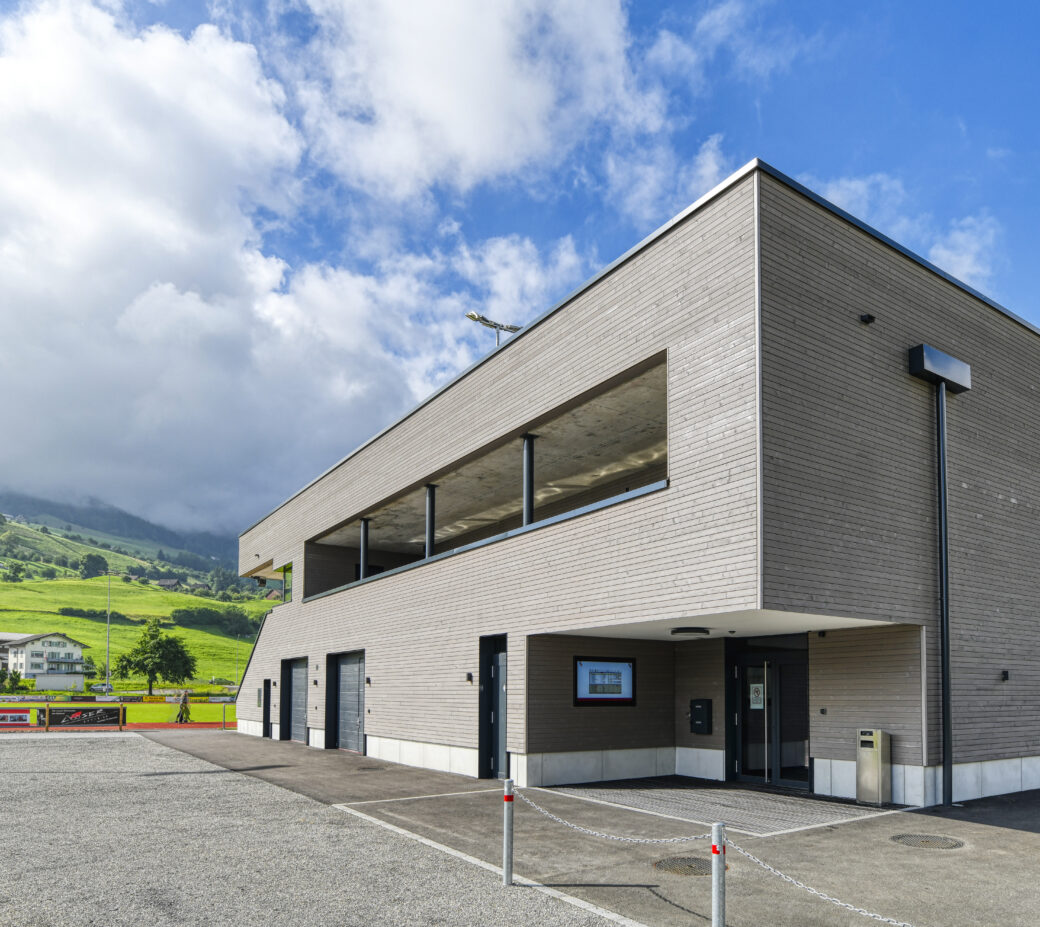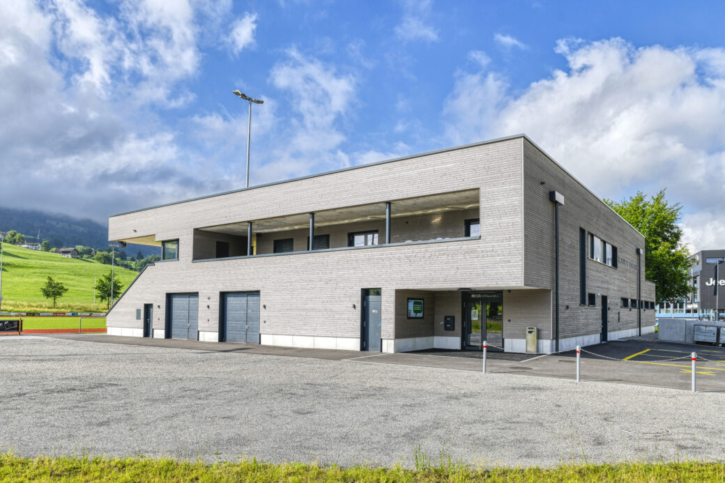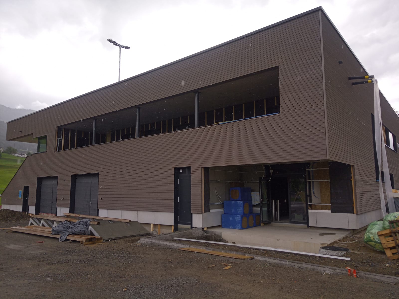 Sportanlage Luterbach, Küssnacht Leistungen Bekleidung aus horizontalen Holzlamellen Fassadenaufbau Metall-Unterkonstruktion Projektdaten Fassadenarbeiten Wärmedämmung und Konsolen Baujahr 2023 Architekt / Bauleiter Bernet & Bernet Architektur AG