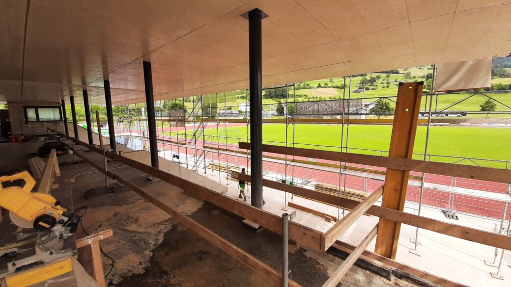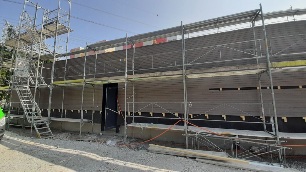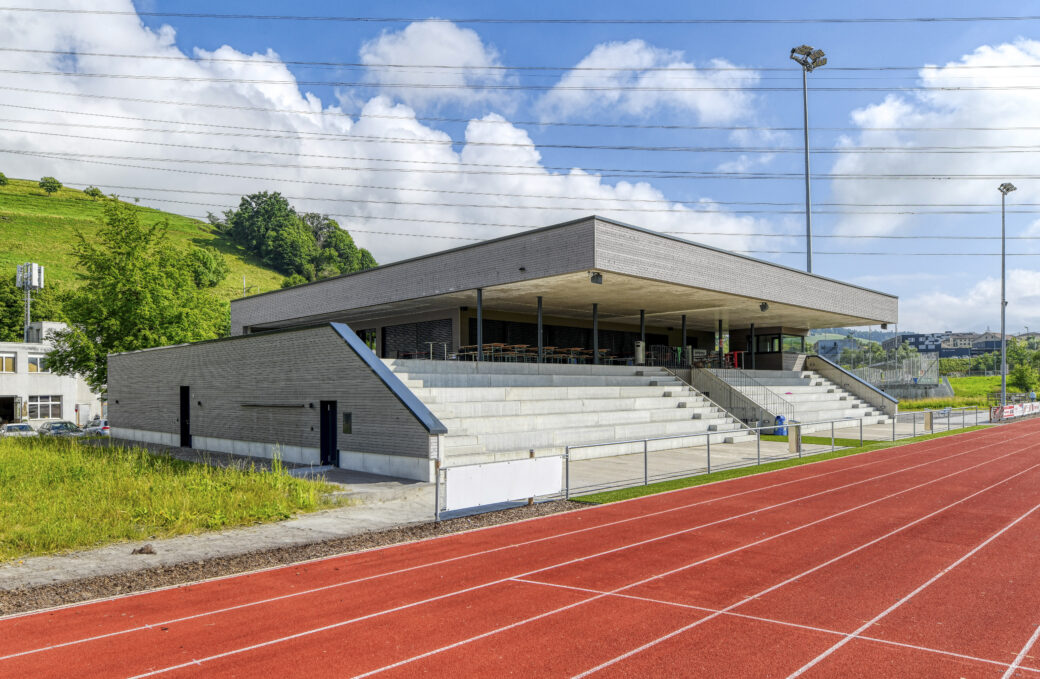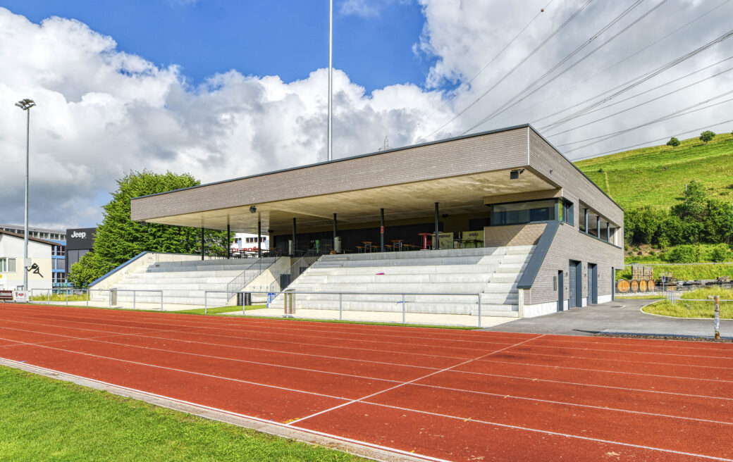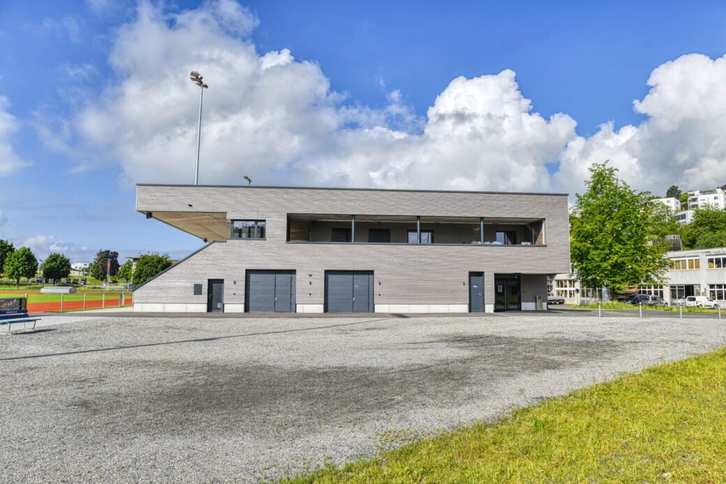 Sportanlage Luterbach, Küssnacht Leistungen Bekleidung aus horizontalen Holzlamellen Fassadenaufbau Metall-Unterkonstruktion Projektdaten Fassadenarbeiten Wärmedämmung und Konsolen Baujahr 2023 Architekt / Bauleiter Bernet & Bernet Architektur AG